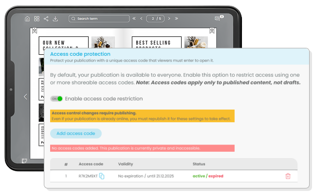 Protect your digital publications, flipbooks, and flipping catalogues with secure access control and decide exactly who can view your content. This feature is ideal for B2B sales teams that need privacy, control, and a professional way to distribute digital catalogues.